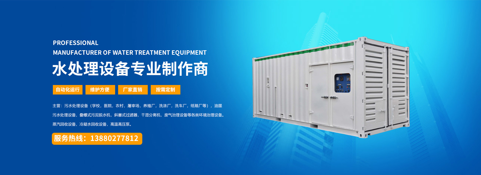 四川宇藍環(huán)保工程有限公司是水處理設備及各類環(huán)境治理設備的生產廠家并承接各類環(huán)境治理設備的工程項目。 公司專門從事各類環(huán)境治理設備及冷凝水蒸汽回收設備的開發(fā)、設計、制造、銷售以及技術服務的綜合性公司,主要產品有:污水處理設備(學校,農村,屠宰場,養殖場,醫院,小區,紙箱廠,洗滌廠等),油墨污水處理設備,疊螺式污泥脫水機,斜塞式過濾器,干濕分離機,廢氣治理設備等各類環(huán)境治理設備以及蒸汽回收設備,冷凝水回收設備,高溫高壓泵等各類節(jié)能減排的節(jié)能設備。 ...